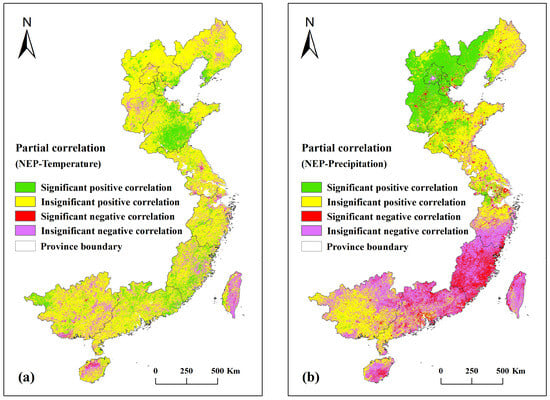 As main islands in coastal regions south of Zhejiang Province, Hainan and Taiwan are located in regions characterized by high humidity and a tropical monsoon climate. From the trend analysis and partial correlation analysis results, it is observed that Hainan and Taiwan exhibit decreasing trends in NEP covering 44.42% and 55.37% of their respective areas. Furthermore, this decreasing trend is primarily negatively correlated with both temperature and precipitation. The results of the partial correlation analysis in Hainan and Taiwan are close to those reported by Chuai et al. []. However, the results of the significance test suggest that this correlation may be generated by random factors. The driving mechanism behind the NEP variations in islands may be more complex. For example, the erosion of coastlines can weaken the carbon sink capacity of coastal areas [].
