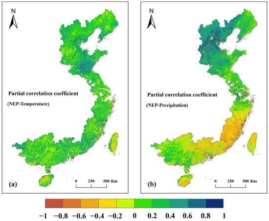 Partial correlation coefficients of NEP and meteorological factors: (a) NEP-Temperature; (b) NET-Precipitation.