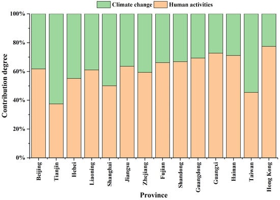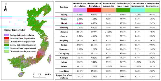 As shown in Table 3, the dominant driver types of NEP among the provinces in CCZ similarly exhibit an obvious north–south difference. NEP changes in provinces north of Zhejiang are mainly characterized by a double-driven improvement. On the contrary, one-factor-induced degradation of NEP is mainly observed in provinces south of Zhejiang. Specifically, the human-driven degradation of NEP mainly occurred in Fujian, Shanghai, and Hong Kong. NEP in Taiwan is mainly characterized by climate-induced degradation, and NEP in Hainan mainly exhibited a double-driven degradation change.