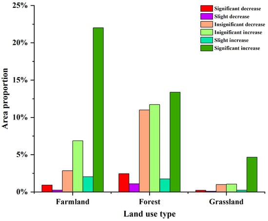 We extracted the unchanged areas of farmland, forests, and grassland in CCZ from 2000 to 2020. Based on an overlay analysis, we explored the relationship between NEP changes and land use type. We excluded discussions about NEP of water bodies, built-up land, and unused land due to their uncertainties and NPP data boundedness in CCZ. As shown in Figure 11, the area of NEP with a significant increase trend is the highest in farmland (22.02%), followed by forests (13.37%), and grassland (4.66%). The area of NEP characterized by an insignificant increase is highest in the forests (11.71%), followed by farmland (6.86%), and grassland (1.06%). A significant decline in NEP was observed mainly in forests (2.45%), followed by farmland (0.93%), and grassland (0.22%). An insignificant decrease in NEP was mainly observed in forests (10.99%), followed by farmland (2.85%), and grassland (1%).
