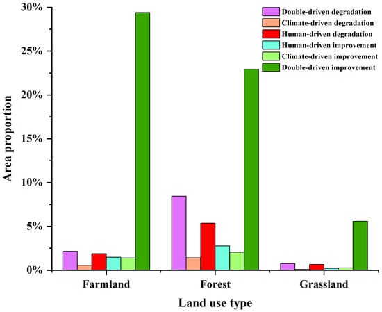 As shown in Figure 12, the area of NEP characterized by double-driven improvement is the highest in farmland (29.41%), followed by forests (22.94%), and grassland (5.59%). The area of NEP characterized by double-driven degradation is highest in forests (8.45%), followed by farmland (2.15%), and grassland (0.76%). The area of NEP showing human-driven degradation is higher than that showing climate-driven degradation in each land use type. Similarly, the area of NEP showing climate-driven improvement is higher than that showing human-driven improvement in each land use type except for grassland.