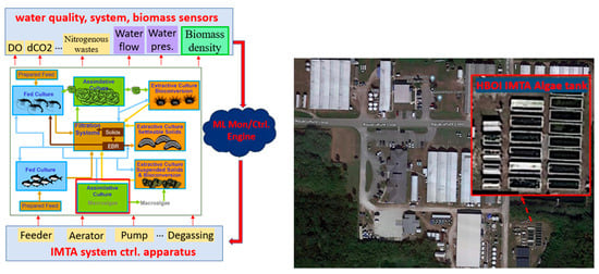 The three common types of aquaculture systems are pond-based, open-water, and recirculating aquaculture systems (RAS). RAS farms employ a controlled environment where water is recirculated after mechanical and biological filtration to remove suspended matter and other wastes. One desirable feature of RAS is that the farm is insulated from external environmental factors. Therefore, it can operate with fewer geographical constraints than ponds or offshore farms. Since 2012, the Harbor Branch Oceanographic Institute at Florida Atlantic University (HBOI) has been at the forefront of developing land-based marine Integrated Multi-Trophic Aquaculture (IMTA) systems []. IMTA facilitates a symbiotic co-culture of various species, where the waste products of one serve as resources for another, enhancing system efficiency and sustainability. Compared with traditional RAS solutions, IMTA provides superior energy efficiency and water utilization, as it leverages the natural biological interactions among species to recycle nutrients and reduce waste. The HBOI IMTA system includes species such as fish, shrimp, urchins, oysters, and macroalgae, also known as seaweed. Figure 1 provides an overview of the IMTA system, illustrating its framework and layout.