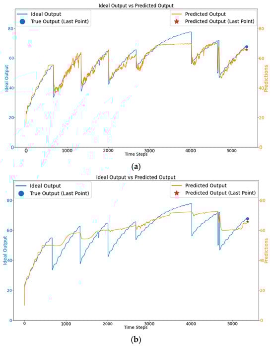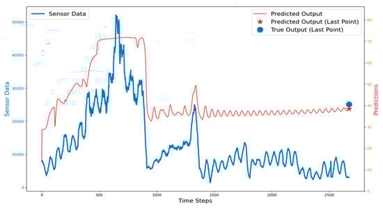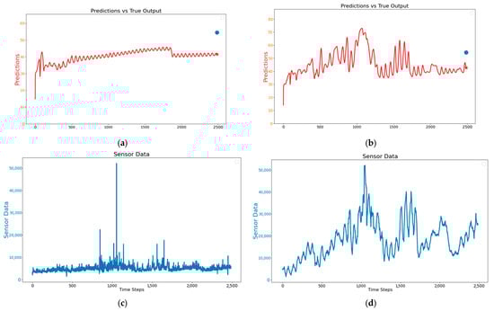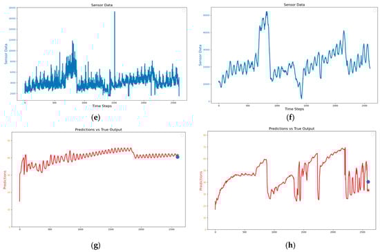 The output predictions, shown in Figure 14g,h, compare the results from using raw sensor data (without preprocessing) and sensor data with a 6-h moving average: