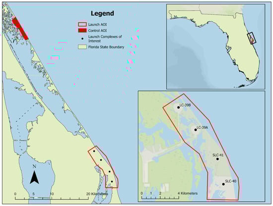 The study location includes the launch AOI (open red polygon) within the Cape Canaveral Barrier Island and the control AOI (closed red polygon) within the Canaveral National Seashore (CANA), Florida. The study location is within east central Florida (upper right inset). The launch AOI contains the four launchpads of interest (Launch Complexes 39B, 39A, 41, and 40 from north to south) and is indicated within an open red polygon (lower right inset). AOI stands for area of interest.