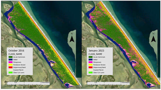 The 2016 and 2023 SVMs’ (support vector machines’) classification maps of the control site located within the Canaveral National Seashore, Florida. The WorldView imagery (copyright 2020 DigitalGlobe NextViewLicense) from 30 October 2016 and 11 January 2023 were used to produce the land cover classification maps.