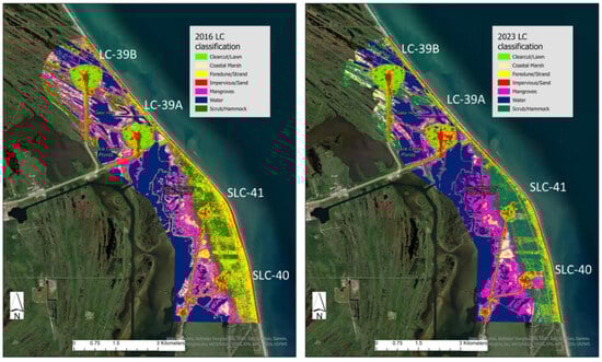Land cover classification maps of the Cape Canaveral Barrier Island’s launch site. The WorldView imagery (copyright 2020 DigitalGlobe NextViewLicense) from 8 October 2016 (left) and 4 August 2023 (right) was used to produce the land cover classification maps. The four launchpads are labeled: Launch Complex (LC)-39B, LC-39A, Space Launch Complexes (SLC)-41, and SLC-40 (top to bottom). The maps were created using ArcGIS software and ArcGIS Online basemap by ESRI (Copyright © Esri. All rights reserved).