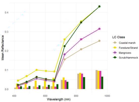In order to examine the similarity between the spectra of the misclassified vegetation classes, spectral profiles of the four natural vegetation cover classes (i.e., coastal marsh, mangroves, foredune/strand, and scrub/hammock) were derived from all pixels of the 2016 and 2023 WV images that correspond to the given classes. The mean reflectance at all bands for the four classes is presented in Figure 4.
