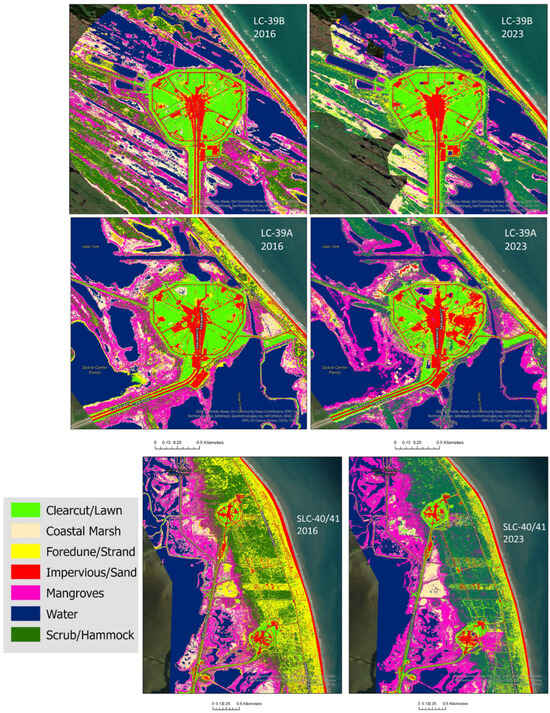 Land cover classification maps of the Cape Canaveral Barrier Island’s launch site. The WorldView imagery (copyright 2020 DigitalGlobe NextViewLicense) from 8 October 2016 and 4 August 2023 were used to produce the land cover classification maps. Top to bottom panels: the vicinities of Launch Complex (LC) 39B, LC-39A, and Space Launch Complex (SLC)-41/40, respectively. The maps were created using ArcGIS software and ArcGIS Online basemap by ESRI (Copyright © Esri. All rights reserved).