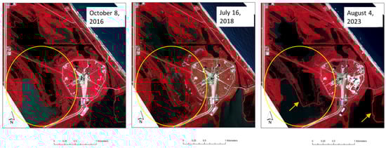 Color infrared displays of the WorldView imagery (Bands 7, 5, and 3, where band centers correspond to 833, 659, and 546 nm, respectively; copyright 2020 DigitalGlobe NextViewLicense) of 8 October 2016 (left), 16 July 2018 (center), and 4 August 2023 (right). The areas of marsh thinning from 2016 to 2023 are indicated with yellow open circles. The impounded areas for mosquito control are shown, which have limited hydrologic connection to the lagoon, as they are separated with dikes (indicated with yellow arrows). The seasonal water level in this region is highest in October and lowest between July and August. (https://psmsl.org/data/obtaining/stations/2123.php (accessed on 1 August 2024)). The MSL was 0.93 m in October 2016, 0.59 m in July 2018, and 0.67 m in August 2023.