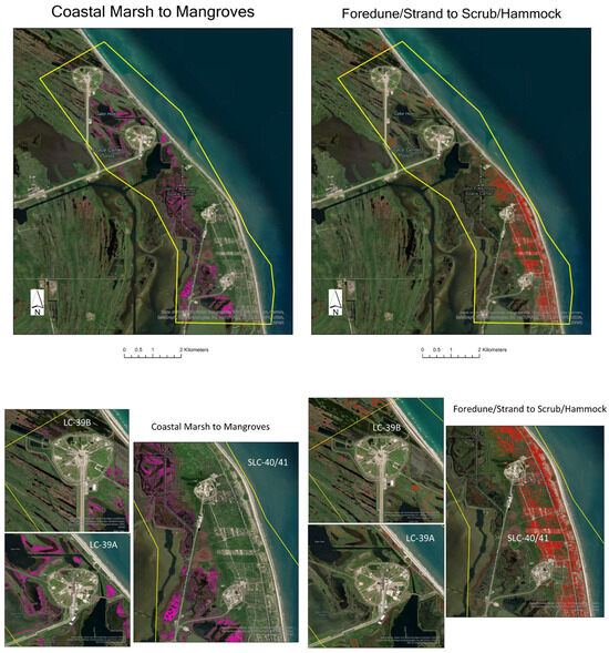 The areas of 2016–2023 land cover (LC) changes from coastal marsh to mangroves (top left) and from foredune/strand to coastal scrub/hammock (top right). The areas of the LC change from coastal marshes to mangroves at the vicinities of the launchpads are denoted with pink (bottom left); and the areas of the LC change from foredune/strand to scrub/hammock are denoted with red (bottom right). The maps were created using ArcGIS software and ArcGIS Online basemap by ESRI (Copyright © Esri. All rights reserved).