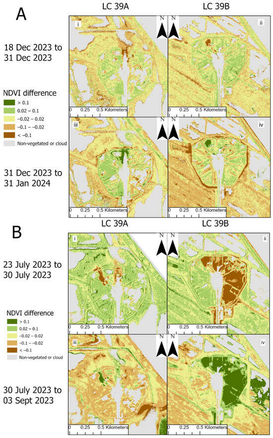 (A) Changes in NDVI values on and surrounding Launch Complex (LC)-39A and the nearby LC-39B before, two days after, and about one month after the 28 July 2023 Falcon Heavy rocket launch from LC-39A. (B) Changes in NDVI values on and surrounding LC-39A and the nearby LC-39B before, two days after, and about one month after the 28 December 2023 Falcon Heavy rocket launch from LC-39A. The open red oval indicates damage associated with the rocket launches. There was no rocket launch from LC-39B (Aii,Aiv,Bii,Biv). (i,ii) NDVI difference before and two days after rocket launches from LC-39A. (iii,iv) NDVI changes one month after the rocket launches.