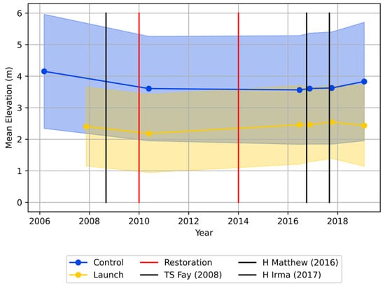 Figure 9 depicts the general elevation trends at the launch and control sites from 2007 to 2018. Prior to 2010, both sites appeared to experience elevation loss. The timing of Tropical Storm Fay in 2008 (15–29 August 2008) is indicated in the plot. From 2010 to 2016, the elevations at the control site were relatively stable while the launch site showed some elevation increases. The elevations at both sites appeared to remain relatively stable through Hurricanes Matthew (28 September–9 October 2016) and Irma (30 August–13 September 2017). A divergence begins to appear in late 2017, with the control site increasing in elevation and that of the launch sites decreasing.