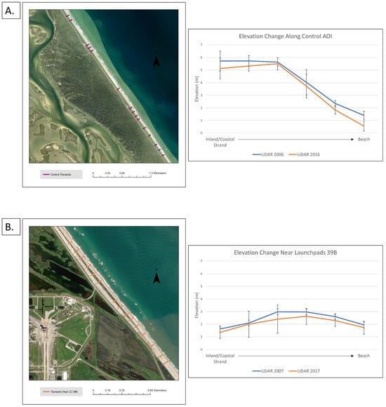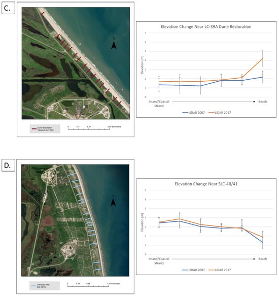 Four locations (CANA control site, LC-39A/B—in between 39A and 39B, LC-39A dune restoration site, and SLC-40/41) were selected for more detailed analysis. At each of these locations, 15 transects, perpendicular to the beach shorelines, were drawn on the LiDAR images to obtain dune profiles. The transect profile data from the 15 transects were used to compare dune elevation between 2006 and 2016 for the control site and between 2007 and 2017 for LC-39A/B and SLC-40/41. The 2018 LiDAR data did not extend to include all locations and, therefore, were not used in this transect analysis. Separate two-tailed t-tests were used to compare elevation changes between the years at the given locations.