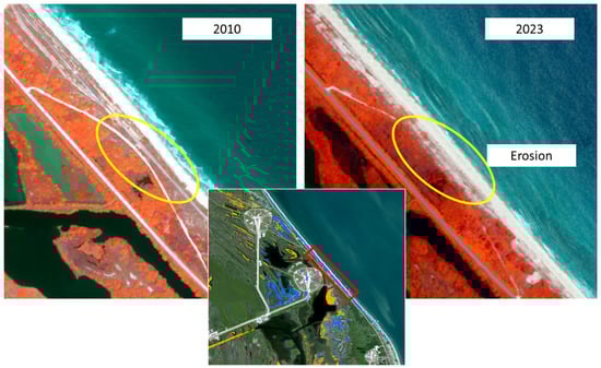 Color infrared images of beach near the Kennedy Space Center’s Launch Complex 39A as indicated by the open red rectangle. Beach erosion and dune vegetation loss (a 40–50 m beach retreat between 2010 and 2023) is observed, as indicated by the open yellow oval along the shoreline near LC-39A. WorldView imagery: copyright 2020 DigitalGlobe NextViewLicense.