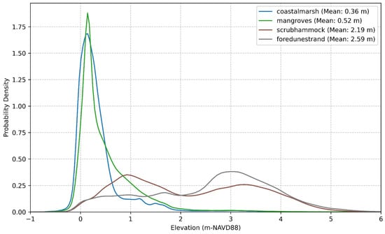 Kernel density estimation plot of elevations across the natural land cover classes from the 2016 SVM classification. The elevations were derived from the 2016 LiDAR data described in Table 3.