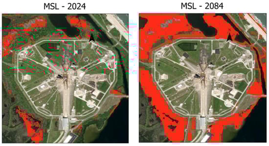 Projected sea-level rise scenarios surrounding LC-39A, based on current mean sea level (MSL, m) from August 2023 to July 2024. The images show MSL water level (red) in 2024 (left) and projected in 2084 (right) within the land surrounding LC-39A.