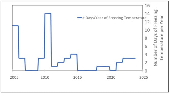 Number of days reaching at or below the freezing temperature (0 °C) per year between January 2005 and December 2023. Air temperature data were collected from the Global Historical Climatology Network daily (GHCNd) station near the Kennedy Space Center (Merritt Island, FL, USA).