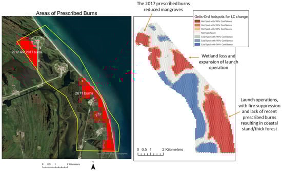 Figure 17 displays the areas of burns from prescribed fires (left) along with the land cover change (from 2016 to 2023) hot spot map (right). The areas from the west to the southwest of LC-39B were burned in 2012 and again in 2017. The most recent prescribed fires near SLC-41 and -41 were in 2011. The land cover change hot spot areas (indicated with red-orange hues in the right panel of Figure 17) encompass the locations of LC-39A, SLC-41, and SLC-40 (Figure 3 and Figure 17 left), the location of 2017 burns to the west of LC-39B which resulted in the loss of mangroves (Figure 7 and Figure 17), and the lack of recent burns (the last burns occurred in 2011) near SLC-40/41 which resulted in strand-to-hammock conversion (Figure 7 and Figure 17). The physical location of LC-39B, which was not used for launches during the study period except for one launch in November 2022, was not included in the hot spots while all other launchpads were within the hot spots (Figure 17). Cold spots indicate areas that are stable and exhibit a significant lack of land cover change; these are largely water bodies whose extent has not been substantially affected between 2016 and 2023.