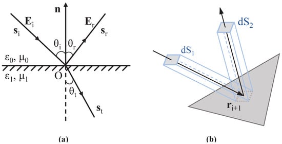 When the ray tube intersects with the target body, it reflects. The plane formed by the incident direction and the normal of the intersection is called the incident plane, as shown in Figure 2a. The angle between the normal unit vector and the incident direction is , while the angle between and reflected direction is . According to Snell’s law, ; thus, the direction of the reflected ray tube is: