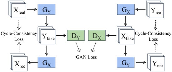 - Zhu, J.-Y.; Park, T.; Isola, P.; Efros, A.A. Unpaired Image-to-Image Translation Using Cycle-Consistent Adversarial Networks. In Proceedings of the ICCV, Venice, Italy, 22–29 October 2017; pp. 2223–2232. [Google Scholar]