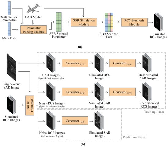 Framework of the SingleScene–SAR simulator. (a) The component of RCS image simulation. (b) The component of SAR image translation.