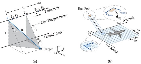 (a) Spaceborne SAR platform motion model. (b) The grid sampling of the target model and the shape vectors of the ray pool.