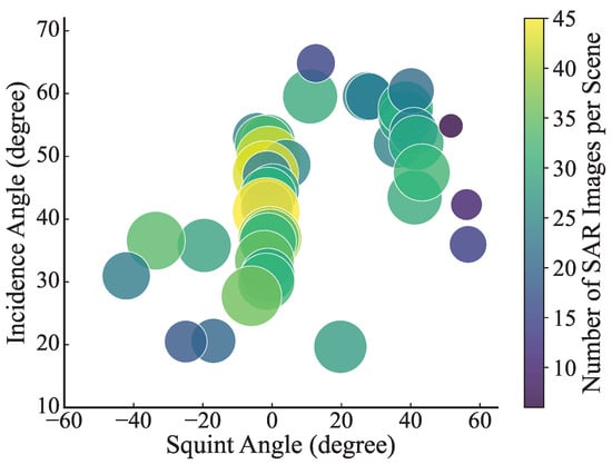 Specifically, the augmentation of the RCS2SAR-30 simulated dataset had the most significant improvement on the target recognition network. The average F1-score improvement of the corresponding four groups was 9.49%, significantly better than the other two simulated datasets. This is because the real SAR images used in this group of experiments have severe side lobe effects and poor imaging quality, resulting in unimpressive performance metrics for the original SAR images group and the enhanced SAR images group. The introduction of the RCS2SAR-30 dataset largely compensates for this disadvantage, resulting in the highest performance improvement difference. In other words, the data augmentation method based on the SingleScene–SAR simulator is particularly suitable for application scenarios where real SAR images are scarce and of poor imaging quality. Correspondingly, the data augmentation of the RCS2SAR-40 simulated dataset has a relatively smaller difference in metric improvement, but the final absolute value is improved to a maximum of 93.58%. This is because the real SAR images used in this group of experiments have an incidence angle of 40°. As shown in Figure 7, lots of samples in the test set have incidence angles around 40°, meaning the difference between the training set and the test set is relatively small. Even though the enhanced SAR images group using RCS2SAR-40 already has good accuracy, the data augmentation of the SingleScene–SAR simulator is still effective in performance improvement.