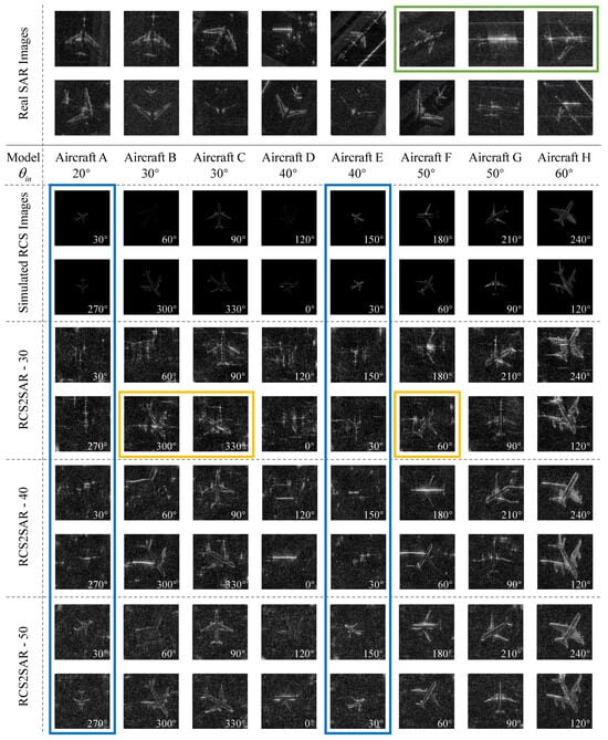 In the samples from the RCS2SAR-30 dataset, side lobe effects in both azimuth and range directions closely resemble those found in real SAR images. This is illustrated by the samples within the yellow box. This phenomenon can be attributed to the substantial side lobe effects present in the training data of the generation network model utilized for the RCS2SAR-30 dataset. Consequently, these effects are retained in the final fitted mapping function. In contrast, the RCS2SAR-40 and RCS2SAR-50 datasets, whose training data for the generation network do not have significant side lobe effects, result in better imaging quality of the final simulated SAR images. Furthermore, the image translation result of the discrete scattering point’s combination structure can be observed in the simulated images of small aircraft (e.g., Aircraft A and E, within blue boxes). These results closely resemble the typical scattering characteristics exhibited by aircraft targets in low-resolution SAR images [38,39,40]. Even though the training data for cycle GAN are high-resolution SAR images, the final translated simulated SAR image still has a similar scattering structure to real SAR images when the aircraft pixels in the given RCS image are few. This indicates that the SBR simulation method with a clear physical mechanism has high generalizability.