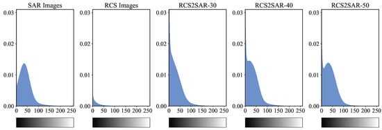 The histogram curve of the simulated RCS images differs significantly from that of real SAR images. In the histogram of the simulated RCS image dataset, the aircraft target occupies only a small region, resulting in a large number of background pixels with zero values. Additionally, the normalization of the RCS images and the presence of a few strong RCS values compress the dynamic range of the images, leading to a very low histogram curve. In contrast, the histograms of the three simulated SAR datasets exhibit distribution characteristics similar to those of real SAR images. On the one hand, the simulated SAR images include background noise that closely resembles the environmental noise in real SAR images, significantly improving the histogram distribution. On the other hand, the mapping process from the RCS image domain to the SAR image domain also affects the final histogram curve. The similarity metrics of the histograms, presented in Table 4, further confirm this observation.