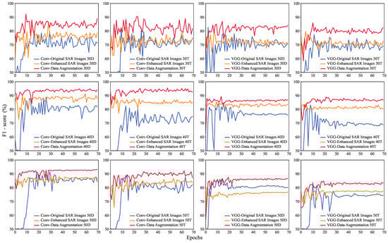 F1-score curves. The experiments are organized from top to bottom according to the simulated datasets RCS2SAR-30, RCS2SAR-40, and RCS2SAR-50. From left to right, the experiments utilize ConvNet and VGGNet architectures with double-sized clutters (D) and triple-sized clutters (T), respectively.