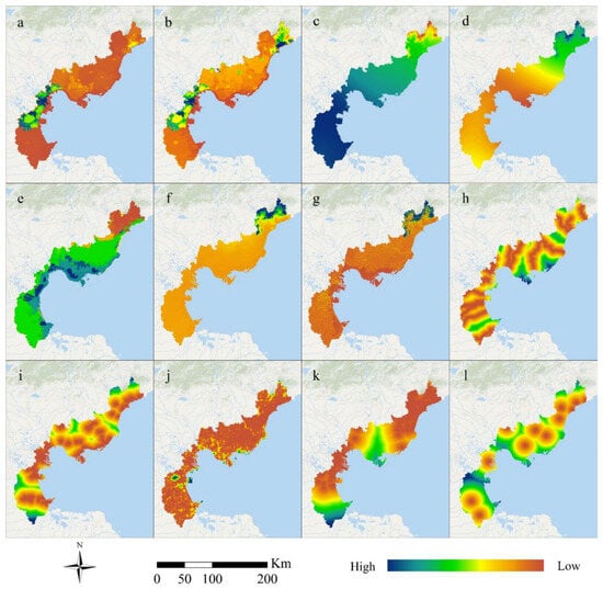 Data on drivers for modeling future wetland types and analyzing changes in carbon storage: (a–h) represent Population, GDP, Temperature, Precipitation, Soil, DEM, Slope, and Distance to the river; (i–l) represent Distance to the road networks (primary, secondary, and tertiary) and Distance to the government using the Euclidean distance method. These elements can characterize the spatial intensity of human activities well.