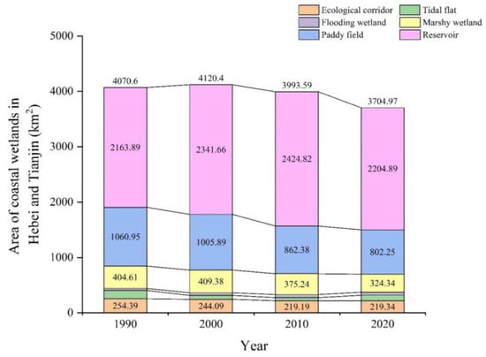 Composition of coastal wetland areas in Hebei and Tianjin, 1990–2020.