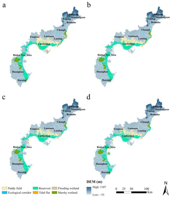 Spatial distribution of coastal wetlands in Hebei and Tianjin, 1990–2020 ((a–d) represent 1990, 2000, 2010, and 2020).