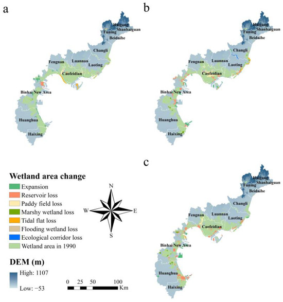 Spatial changes in coastal wetlands in Hebei and Tianjin, 1990–2020 (a–c represent 1990–2000, 2000–2010, and 2010–2020).