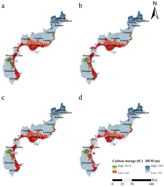 Spatial distribution of carbon storage in the coastal wetlands of Hebei and Tianjin, 1990–2020 ((a–d) represent 1990, 2000, 2010, and 2020).