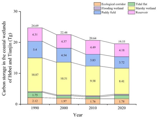 Composition of carbon storage in the coastal wetlands of Hebei and Tianjin, 1990–2020.