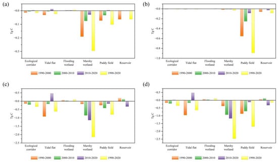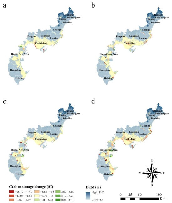 Changes in carbon storage in the coastal wetlands of Hebei and Tianjin from 1990 to 2020 ((a–d) represent 1990–2000, 2000–2010, 2010–2020, and 1990–2020).
