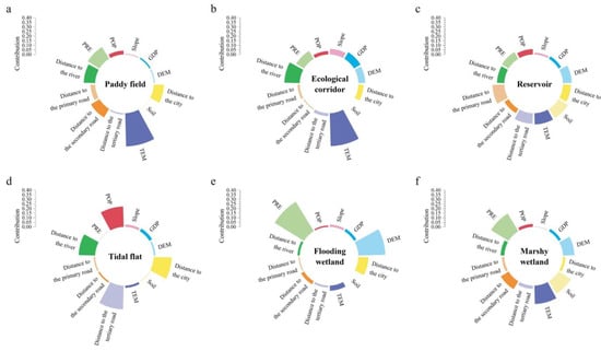 Key drivers of carbon storage changes in the Hebei–Tianjin coastal wetlands. (a–f) Paddy field, Ecological corridor, Reservoir, Tidal flat, Flooding wetland, Marsh wetland.
