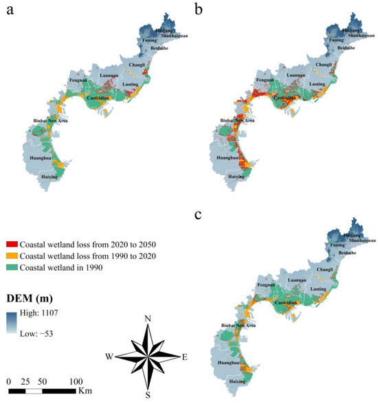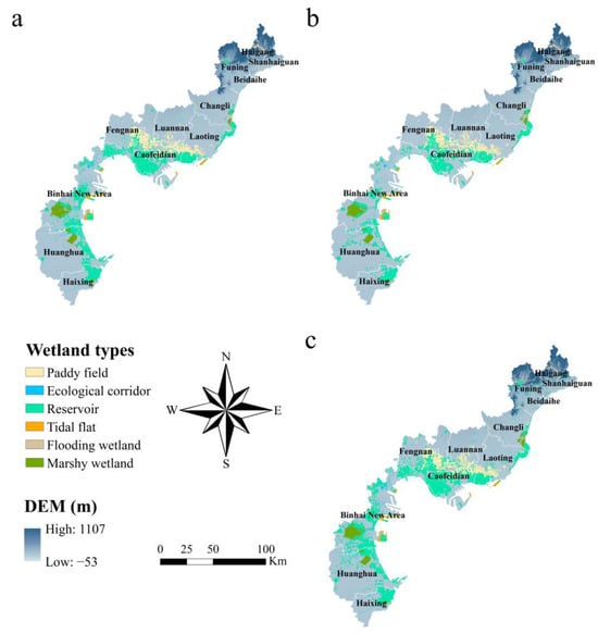 Spatial distribution of coastal wetlands in Hebei and Tianjin, 2050 (where (a) represents the NTS, (b) represents the EPS, and (c) represents the WRS).