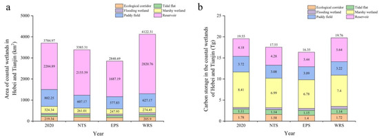Wetland types exhibited area values under the three scenarios, and their spatial distribution patterns displayed notable differences (Figure 10). Under the NTS, the coastal wetlands of Hebei and Tianjin continued to decline in area, with an area of 3,385.31 km2 (Figure 11a). This trend suggests that the Hebei and Tianjin coastal wetland area is projected to decrease further based on current development trajectories. In contrast, the EPS shows increased wetland degradation, resulting in a wetland area of only 2848.69 km2. This suggests that a heightened focus on economic development may lead to further harm to coastal wetland areas. Conversely, the WRS predicts a significant increase in coastal wetland area, reaching 4122.31 km2.