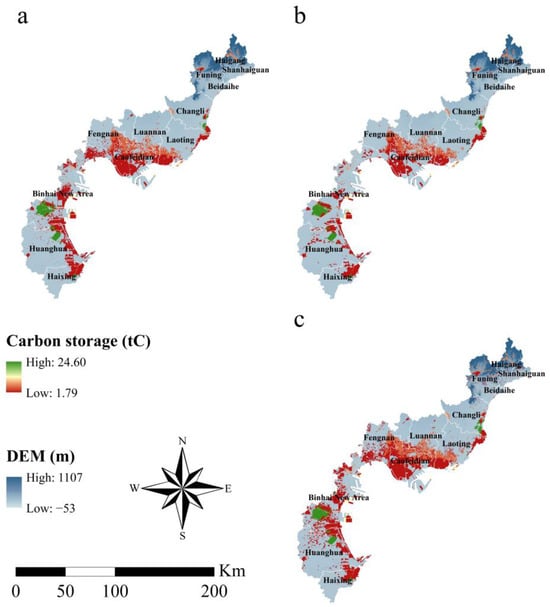 Spatial distribution of carbon storage in the coastal wetlands of Hebei and Tianjin, 2050 ((a–c) represent 2050 (NTS), 2050 (EPS), and 2050 (WRS)).