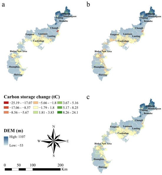 Changes in carbon storage in the coastal wetlands of Hebei and Tianjin from 2020 to 2050 ((a–c) represent 2020–2050 (NTS), 2020–2050 (EPS), and 2020–2050 (WRS)).