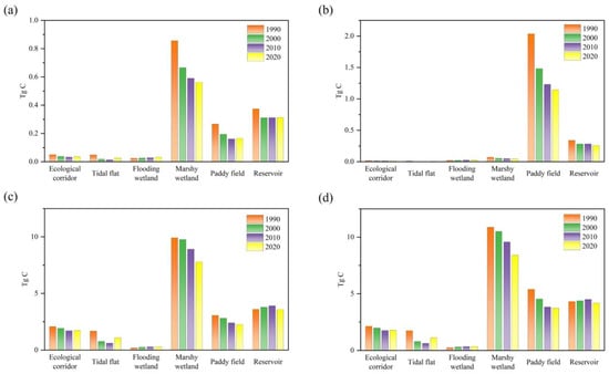 This study utilizes land use data from four distinct periods: 1990, 2000, 2010, and 2020, with a spatial resolution of 30 m × 30 m, because 30 m × 30 m resolution data can provide more accurate and clearer results. The data were harmonized through access to the Centre for Resource and Environmental Sciences, Chinese Academy of Sciences (https://www.resdc.cn, accessed on 16 November 2024). The data are considered specific types of local wetlands and are classified according to the Convention on Wetlands, Classification of Wetland (GB/T 24708-2009) [29,30], resulting in six distinct types of coastal wetlands (ecological corridor, tidal flat, flooding wetland, marshy wetland, paddy field, reservoir). Additionally, carbon density data for coastal wetlands were categorized into four types (Table 1) (Supplementary Materials, Data S1: Carbon density in coastal wetlands).
