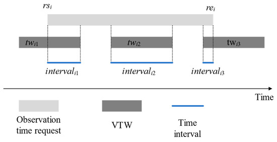 We define the task set , where M is the total number of tasks. For task , the observation profit is , the observation duration is , and the observation time requested by the customer is . The number of VTWs for task is . The set of VTWs for task is , where . represents the observation time for task , where .
