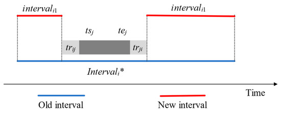 Figure 2 provides a description of new time intervals. If scheduled task j overlaps with the feasible time interval of task i, the feasible time interval of task i is updated according to the duration of task j and the transition time between the two tasks. If task i is scheduled, it should be observed in one of the feasible time intervals.