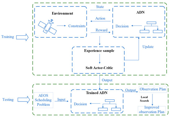 Figure 3 shows the overall framework of the proposed method. In the training stage, we first established the designed ADN and initialized its parameters. Subsequently, considering the constraints of the AEOSSP, we built a system environment, and the experience samples used for training were generated through the interaction between the ADN and the environment. Based on experience samples, the SAC algorithm was employed to train the ADN model. Finally, the trained ADN model was the output. In the testing stage, the trained ADN was used as a solution strategy to generate the observation plan. The observation plan can then be enhanced via a start-time-shift-based local search.