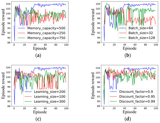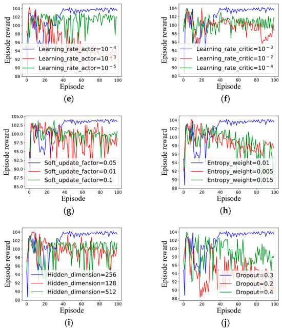 The results of the parameters set in Table 4 are shown in blue curves. It can be observed from Figure 7 that the memory capacity, batch size, learning size, discount factor, learning rate of the actor, learning rate of the critic, soft update factor, entropy weight, hidden layer dimension of the networks, and dropout are all sensitive parameters for the algorithm. Deviation from the values in Table 4 leads to non-convergence or convergence to smaller episode rewards. The sensitivity of the maximum number of episodes can be found in Figure 6. The training curve oscillates around a value after the training episode reaches a certain number.