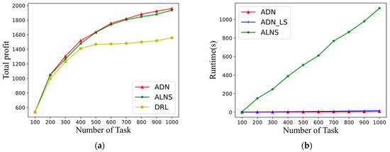 Average results vary with the number of tasks. (a) Average total profits of ADN, ALNS, and DRL. (b) Average runtimes of ADN, ALNS, and ADN_LS.