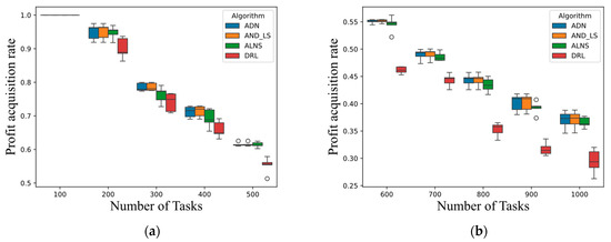 Profit acquisition rates of ADN, ADN_LS, ALNS, and DRL. (a) Results of 100-, 200-, 300-, 400-, and 500-task scenarios. (b) Results of 600-, 700-, 800-, 900-, and 1000-task scenarios.