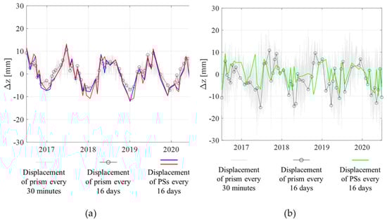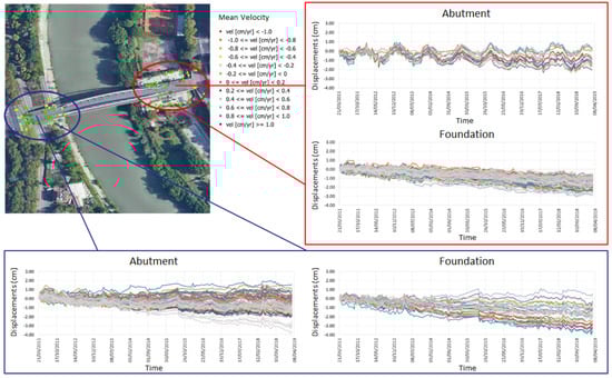 Time series for displacements, ascending orbit. Different color lines refer to different PSs [].